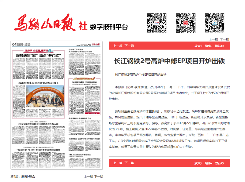 Maanshan Daily: Blowing-in and Tapping of No. 2 BF Medium Maintenance EP project of Changjiang Steel