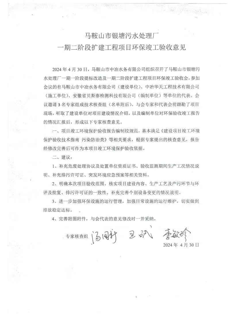 馬鞍山市銀塘污水處理廠一期二階段改擴(kuò)建工程項目根據(jù)《建設(shè)項目環(huán)境保護(hù)管理條例》、《建設(shè)項目竣工環(huán)境保護(hù)驗收暫行辦法》等相關(guān)規(guī)定于2024年4月30日組織召開竣工環(huán)境保護(hù)驗收會。會議按照相關(guān)要求由馬鞍山市中冶水務(wù)有限公司(建設(shè)單位)、中冶華天工程技術(shù)有限公司(施工單位)、安徽省貝斯泰檢測科技有限公司(編制單位)等單位的代表,會議邀請3名專家組成技術(shù)核查組,工作組通過現(xiàn)場勘查、詢問、討論等方式最終形成了驗收意見,意見認(rèn)為項目具備環(huán)境保護(hù)驗收條件,項目驗收合格。現(xiàn)將相關(guān)資料給予公開,公示期為2024年5月11日至2024年5月26日。公示期間公眾可通過電話或者郵件與我公司聯(lián)系。