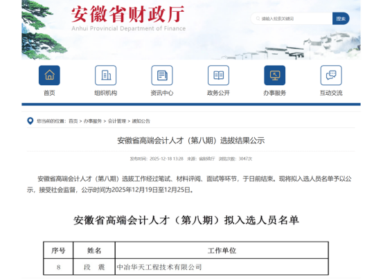 12月18日,安徽省財政廳公布“安徽省高端會計人才”(第八期)錄取人員名單,經(jīng)過材料評審、現(xiàn)場筆試、專家面試等多輪考核,中冶華天財務(wù)管理部員工段震從眾多候選人中脫穎而出、成功入選,有力展現(xiàn)了華天財務(wù)人員的綜合實力與向上風(fēng)采!